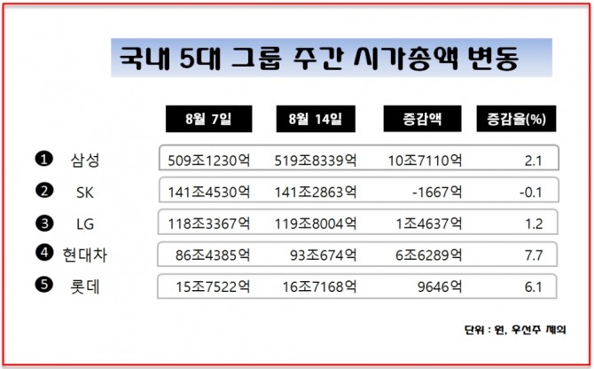 이미지 확대보기글로벌이코노믹은 8월 7일부터 14일까지 한 주간 국내를 대표하는 5개 그룹(삼성, SK, LG, 현대차, 롯데) 70개 상장사의 주가 변동을 분석했다.
