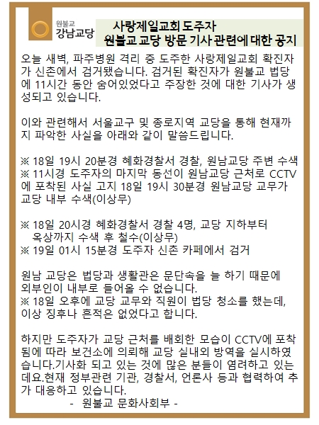 원불교 문화사회부는 "원남교당은 법당과 생활관 문단속을 늘 하기 때문에 외부인이 내부로 들어올 수 없다"며 "18일 오후 교당 교무와 직원이 법당 청소를 했는데, 이상 징후나 흔적은 없었다. 다만 도주 확진자가 교당 근처를 배회한 모습이 CCTV에 포착돼 보건소에 의뢰, 교당 실내외 방역을 실시했다"고 설명했다.