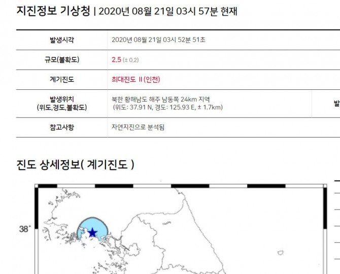 이미지 확대보기기상청은 21일 오늘날씨와 특보에서 평양 남쪽에 위치한 북한 황해남도 해주 남동쪽서 규모 2.5 의 지진이 발생했다고 밝혔다.