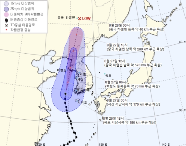 태풍특보가 충청도, 전라도, 제주 및 일부 경기, 강원, 경상도 지역에 발효된 가운데 최대 순간 시속 144㎞, 초속 40m 이상의 매우 강한 바람이 불고 있으며, 시간당 10~30㎜의 강한 비가 내리는 곳이 있다.