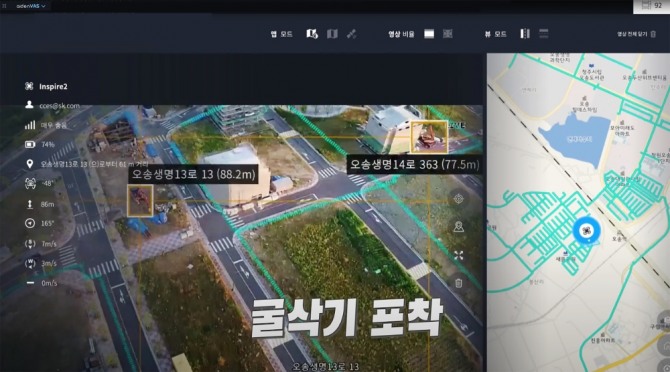 SK C&C의 비전 AI 솔루션 '에이든'과 연계한 드론이 사람이 접근하기 어려운 주택가 밀집지역이나 택지개발지구 등 안전관리 취약 지역에 위치한 시설물·가스관 등을 감시한다.