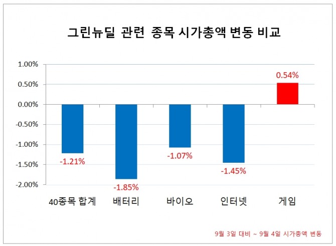 이날 게임 부문만 유일하게 시가총액이 증가했으며, 배터리, 바이오, 인터넷 부문은 감소했다.