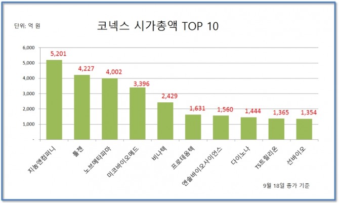 ▲1위 지놈앤컴퍼니(5201억 원) ▲2위 툴젠(4227억 원) ▲3위 노브메타파마(4002억 원) ▲4위 미코바이오메드(3396억 원) ▲5위 비나텍(2429억 원) ▲6위 프로테옴텍(1631억 원) ▲7위 엔솔바이오사이언스(1560억 원) ▲8위 다이노나(1444억 원) ▲9위 TS트릴리온(1365억 원) ▲10위 선바이오(1354억 원)