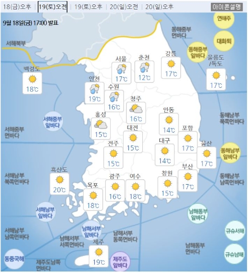 내일은 낮과 밤의 기온차가 크겠다. 19일 전국 아침 최저기온은 11~19도, 낮 최고기온은 23~27도를 오가겠다.
