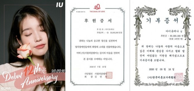 이미지 확대보기아이유 소속사 이담(EDAM)엔터테인먼트는 18일 공식 인스타그램에 아이유와 팬덤 '유애나' 이름을 합친 '아이유애나' 명의로 사회복지단체 사랑의달팽이와 한국미혼모가족협회에 각각 5000만원씩 총 1억원을 기부한 증서를 게재해 아이유와 팬덤의 선행을 알렸다.