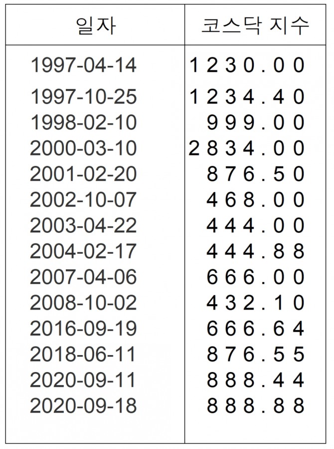 한일 월드컵이 열린 2002년 그해 10월 7일 코스닥 지수는 짝수로만 구성된 468.00 을 기록했다.
