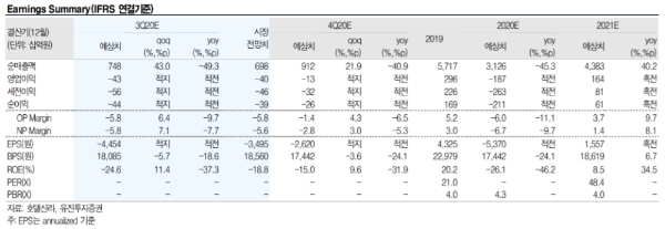 KB증권도 적자폭이 축소될 것으로 보고 있다. KB증권은 3분기 매출액 8248억 원(-44% ), 영업적자 328억 원으로 추정하고 있다. 이는 시장기대치(영업적자 374억 원)를 웃도는 수준이다.