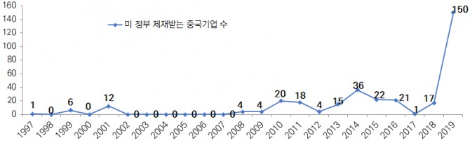 미국의 제재를 가장 많이 받은 업종은 집적회로와 통신업이다. 제재 대상기업 239개사(2019년 말 기준) 중 46개사가 집적회로, 35개사가 통신 관련 기업이다. 모두 중국 정부가 최근 몇 년간 대대적으로 육성·지원 중인 산업이다. 미국 정부가 중국 테크기업 제재를 통해 중국의 제조업 강국 도약을 견제하고 있다고 전문가들은 보고 있다.