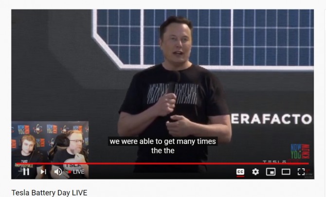 테슬라 배터리데이에서 발언 중인 일론 머스크. 사진=유튜브 캡처