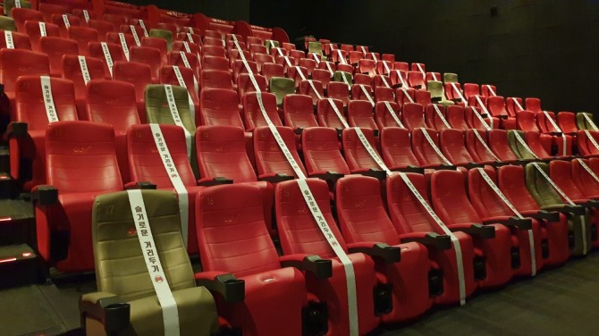멀티플렉스 극장들이 추석 연휴에 대비한 특별 방역에 힘쓰고 있다. 사진은 원활한 좌석 간 거리두기를 위해 좌석에 띠를 두른 상영관의 모습. 사진=CJ CGV