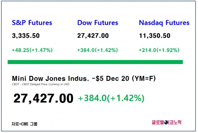 스탠더드 앤드 푸어스(S&P) 500 지수 선물은 1.47%(48.25포인트) 상승한 3335.5포인트에 거래되고 있고, 나스닥 100 선물은 1.92%(214포인트)상승한 1만1350.5포인트에 거래되고 있다.