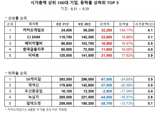 [표] 9월 한달간 시가총액 상위 100대 기업의 주가 등락율 상하위 TOP 5