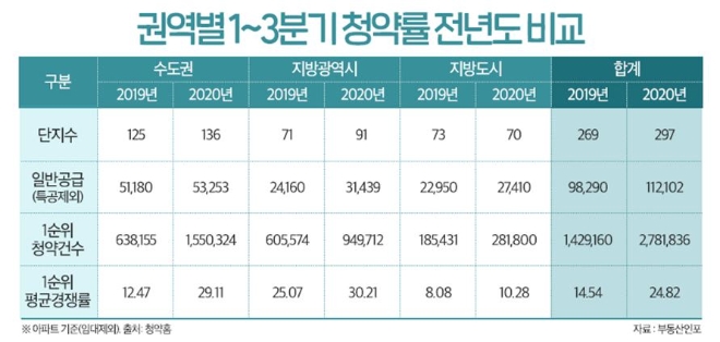권일 부동산인포 리서치팀장은 "1순위자 청약이 급증한 수도권의 경우 인천과 경기 수원 등의 비규제지역 풍선효과와 서울의 경우 시세차익과 똘똘한 새 아파트 분양 수요가 크게 늘었다"면서 "특히 코로나19로 바뀐 주거트렌드인 공간의 활용과 세대 또는 단지 내에서 많은 것을 해결할 수 있는 단지들이 실제 청약에서 좋은 성적을 거뒀다“고 설명했다.