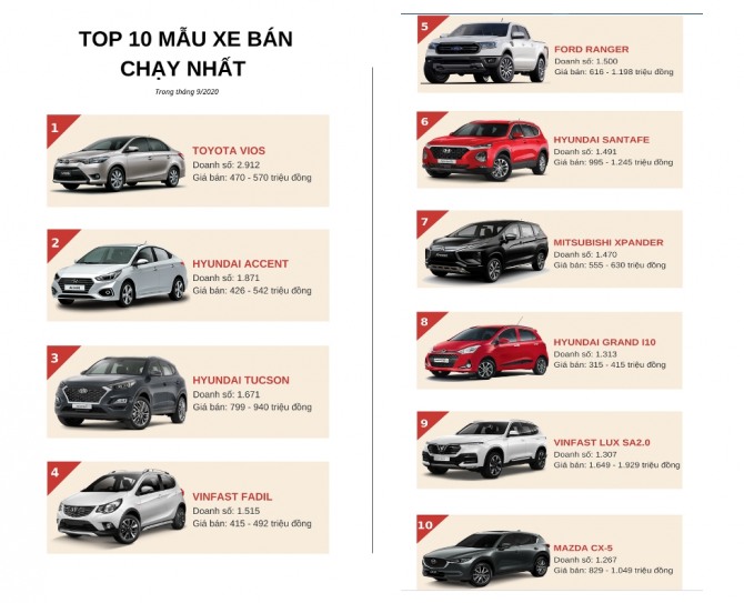 모델별로는 도요타의 소형 세단 비오스(Vios)가 전월보다 759대 증가한 2912대로 가장 많이 판매됐다. 다음으로 현대차 액센트(Accent)는 424대 증가한 1871대로 2위를, 투싼(Tucson)은 1671대로 3위, 싼타페(Santafe)는 1491대로 6위를 차지해 눈길을 끌었다. 그동안 SUV차량은 베트남에서 톱10순위에 없었지만 9월에 2종의 모델이 순위에 올랐다. 전통적으로 도요타 비오스와 선두다툼을 하던 경차 그랜드 i10은 1313대로 8위를 기록했다.