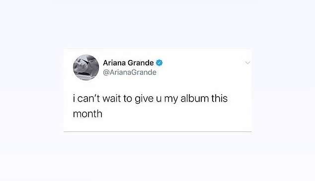 이 매체는 팝의 여왕 아리아나 그란데는 14일 자신의 SNS를 통해 "이번 달에 내 앨범을 너에게 주고 싶어"라는 글을 올려 팬들을 흥분시켰다고 덧붙였다.