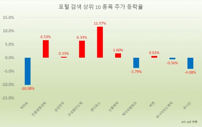 오전 9시 10분 현재 포털사가 집계하는 검색량 기준 상위 20개 종목의 현황은 다음과 같다.