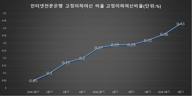 김두관 더불어민주당 의원이 한국은행에서 제출받은 자료에 의하면 인터넷전문은행의 고정이하여신비율은 2018년 0.05%에서 올해 2분까지 지속적으로 상승했다. 올해 2분기 기록인 0.43%는 2018년 3분기에 이어 가장 높은 상승폭을 나타냈다.