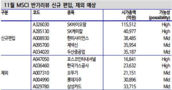 반기변경에서 편출입 종목의 세대교체도 활발할 전망이다. 신한금융투자는 11월 MSCI 반기 리뷰에서 SK바이오팜, SK케미칼, 한미사이언스, 제넥신, 두산중공업이 신규편입될 것으로 추정하고 있다. 반면 포스코인터내셔널, 한국가스공사, 오뚜기, 롯데지주, 삼성카드 등이 제외될 것으로 전망한다.