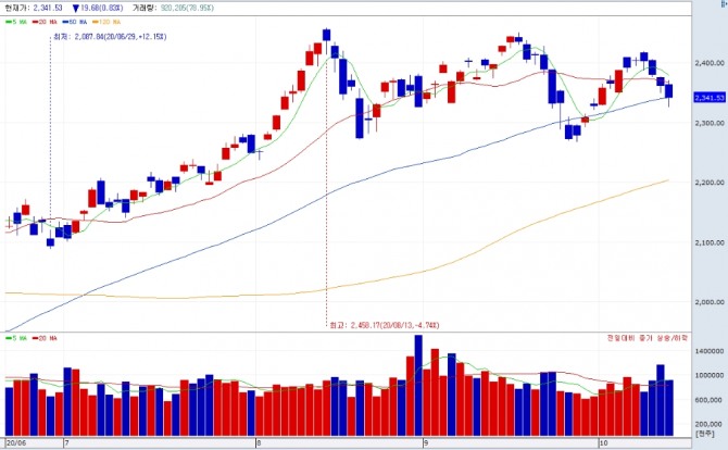 이미지 확대보기한글날 연휴 기간 동안 미국 증시가 강세를 보인 덕에 주 초반 상승세를 보였으나, 코로나19 치료제 및 백신에 대한 부정적 소식까지 이어지면서 조정을 받았다.