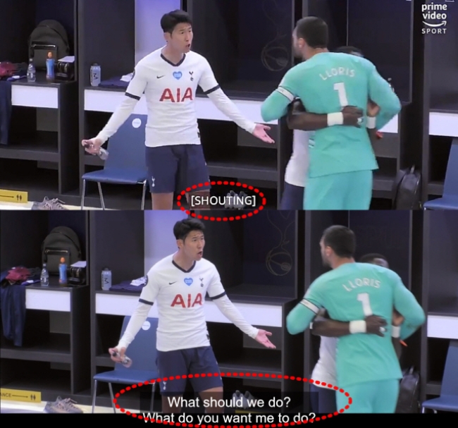 손흥민이 토트넘을 대상으로 한 아마존 프라임 다큐멘터리 ‘All or Nothing’ 촬영에 대한 불만을 토로했다. 사진은 손흥민과 GK 요리스가 말다툼을 하는 다큐멘터리의 한 장면.