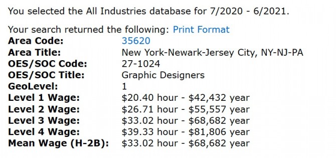 이 개정안에 의해서 임금이 얼마나 인상되는지 예를 들어보면, 뉴욕시 지역의 그래픽 디자이너의 경우 1단계 임금이 년 $42,432에서 연 $57,990으로 인상되었다. 기존의 2단계 연봉보다도 많은 금액이 된다. 2단계 연봉은 $55,557에서 $82,285로 인상되었다. 이 금액은 기존의 4단계보다도 많은 금액이다.