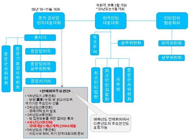 중국의 권력구조와 정책방향은 5년을 주기하는 중국 공산당 전국대표대회에서 결정된다. 이를 전대(全大)라고 하며 당대회로 볼 수 있다. 올해는 제 19기 당대회(2017-2022)의 4차년도 전체회의(5중전회)가 개최되는 해이며 통상 5중전회에서는 경제개발 5개년계획 건의안이 제출된다. 5중전회에서 제출된 건의안은 2021년 전인대의 심의 및 통과를 거친후 정식 시행하게 된다.