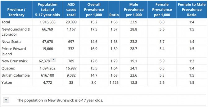 캐나다 ASD 진단 아동 및 청소년 통계(2015년)