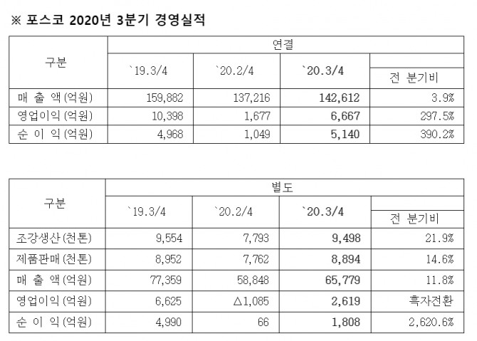 별도 재무제표 기준으로도 포스코는 한 분기만에 흑자 전환에 성공해 별도 기준 매출 6조 5779억 원, 영업이익 2619억 원, 순이익 1808억 원을 기록했다.