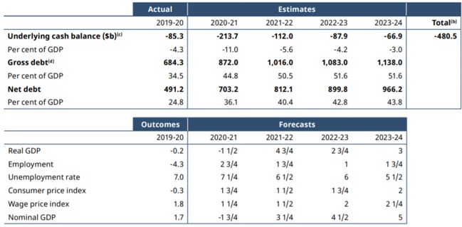 호주 준비은행에 따르면 코로나 부양책으로 약 2,990억 호주달러가 지출되었으며 이는 호주 GDP의 14.6%에 해당하는 막대한 지원이었다. 호주 정부의 순 부채는(Net debt) 2020년6월30일 GDP의 24.8%인 4,912억 호주달러에서 2021년6월30일에는 GDP의 36.1%까지 늘어나 7,032억 호주달러에 이를 예정이다. 2020/2021년 총 정부 수익은 4,724억 호주달러, 총 예산 지출은 6,703억 호주달러로 1,979억 호주달러 적자가 예상되고 있다.