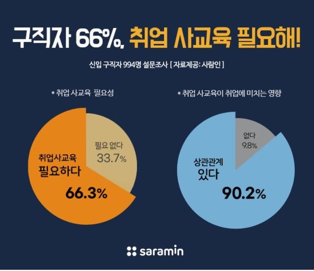 이미지 확대보기구인구직 매칭 플랫폼 사람인이 26일 신입 구직자 994명을 대상으로 ‘취업 사교육에 대한 생각’을 조사한 결과, 66.3%가 ‘필요하다’고 응답한 것으로 나타났다.
