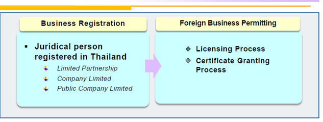 한편, 외국인이 태국에서 규제업종에 해당하는 사업을 수행하고자 할 경우(100% 외국인 지분 소유) ‘외국인 사업 허가’를 받아야 한다. 외국인 사업 허가를 취득할 수 있는 방법은 태국 상무부로부터 '외국인 사업허가(FBL; Foreign Business License)'를 취득하거나 투자진흥 기관으로부터 '투자확인서'를 발급받는 경우 두 가지로 구분된다. 투자확인서는 태국과의 자유무역협정(FTA) 체결한 국가의 기업활동 신청(미국, 호주, 일본이 해당) 또는 태국투자청(BOI), 태국산업단지공사(IEAT; Industrial Estate Authority of Thailand), 동부경제회랑사무국(EECO; The Eastern Economic Corridor Office of Thailand) 등에서 투자 확인서를 발급받는 경우가 있다.
