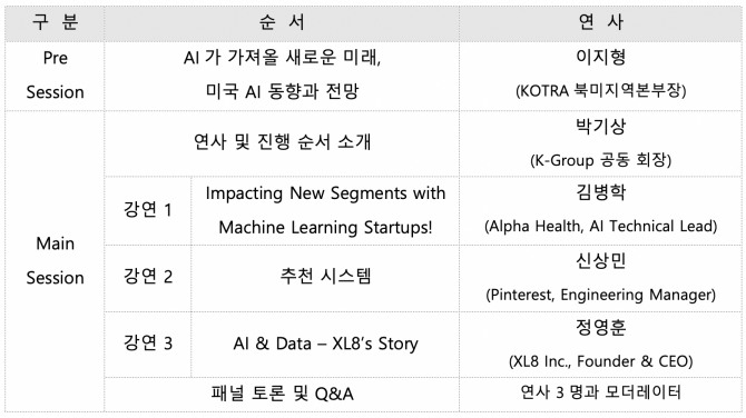 특히 KOTRA 실리콘밸리 무역관은 K-Tech Online 행사와 K-Global 행사를 통해 미국의 AI동향과 전망을 한국 기업과 학계에 전달하는 역할을 함으로써 한국 AI 기업들이 글로벌 무대에 나설 준비를 할 수 기회를 마련하고 그 밖에도 기술 경쟁력을 가진 국내 AI 스타트업들의 파트너사 발굴과 투자유치도 지원하고 있음을 강조하며 프리세션이 종료됐다.