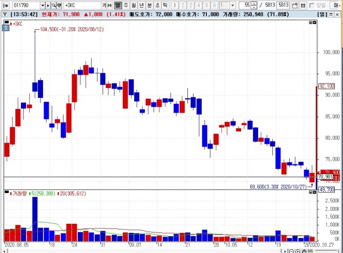 예를 들어 위의 그래프는 SKC의 8월이후부터의 주가 동향을 나타냈다.