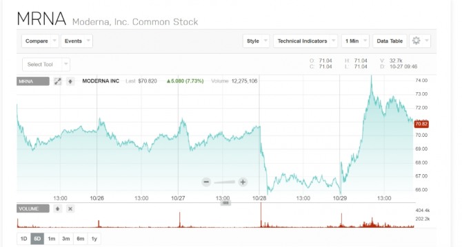 이미지 확대보기30일 뉴욕증시에 따르면 모더나 주가는 이 시각 현재 7% 대 후반 으로 치솟고 있다. 장중한 때는 모더나의 상승률이 9%에 육박하기도 했다. 모더나 뿐 아니라 아스트라제네카 화이자 등 코로나 관련주들도 뛰고 있다.