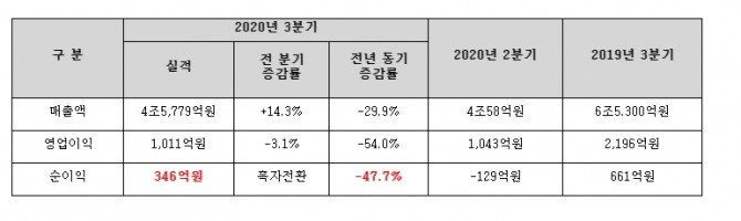 3분기 회사 매출액은 전년 동기 대비 29.9% 감소한 4조5779억원이다.