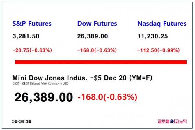 스탠더드 앤드 푸어스(S&P) 500 지수 선물은 0.63%(20.75포인트) 하락한 3281.5포인트에 거래되고 있고, 나스닥 100 선물은 0.99%(112.5포인트)하락한 1만1230.25포인트에 거래되고 있다.