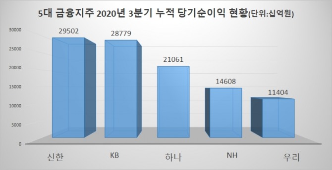 NH농협금융은 3분기 5505억 원, 누적 1조4608억 원의 당기순이익을 기록하며 우리금융의 3분기 4798억 원, 1조1404억 원 실적을 앞섰다.