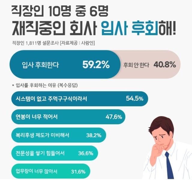 이미지 확대보기구인구직 매칭 플랫폼 사람인이 3일 직장인 1811명을 대상으로 조사한 결과, 59.2%가 ‘입사를 후회한다’고 응답한 것으로 나타났다.