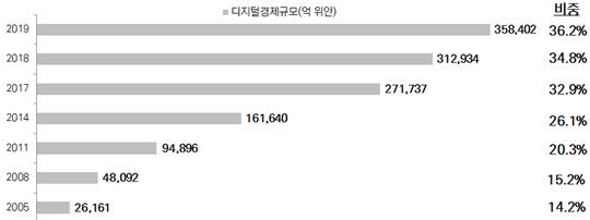 중국 디지털경제는 지난 4년간(2016~2019년) 연평균 12.1% 속도로 급성장했다. 2019년 전년대비 15.6% 증가한 35조8000억 위안에 도달했으며, GDP 내 비중은 36.2%에 달한다.