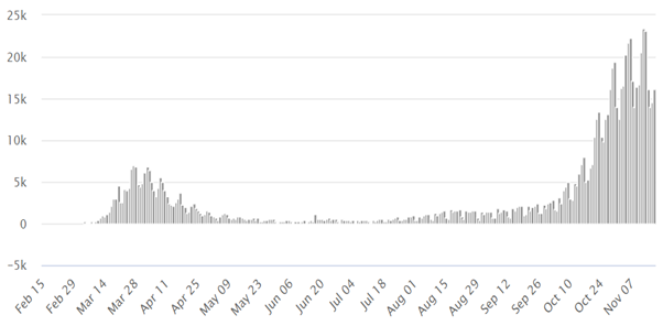 독일에서는 코로나19의 2차 확산이 진행 중이다. 독일은 4~5월 전국 록다운을 통해 신규 확진자 수를 1일 300명으로 줄이는데 성공했으나 여름휴가 후 밀집된 실내 체류기간이 길어지면서 9월부터 신규 확진자 수가 급증하기 시작했다. 8월 말 700명에 불과했던 1일 신규 확진자 수는 11월 13일 2만3542명에 도달했다.