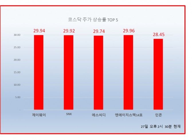 이미지 확대보기27일 오후 코스닥 시장에서 제이웨이, SNK, 에스씨디, 엔에이치스팩14호 가 상한가를 기록하고 있다.