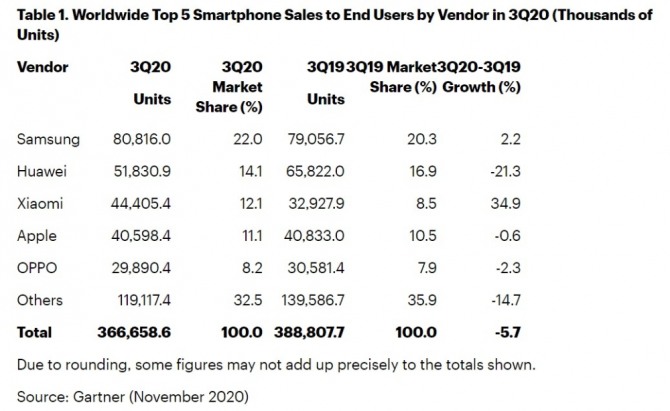 2위에 오른 화웨이는 5183만대를 판매해 점유율 14.1%를 유지했다. 지난해 3분기에는 6582만대를 판매했으나 도널드 트럼프 대통령의 경제제재 여파로 판매량이 21.3% 감소했다.