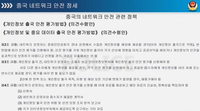 중국공안부 제1연구소 딩양(丁楊) 연구원은 중국 정부가 최근 사이버보안 및 개인정보 강화에 주력하고 있다며 2021년 말까지 <개인정보보호법> 및 데이터 해외 이전 관련 법규가 전인대 상무위(=중국의 입법기관)에서 통과될 것으로 내다봤다.