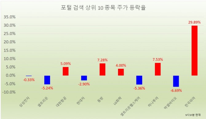 오전 9시 57분 현재 포털사가 집계하는 검색량 기준 상위 20개 종목의 현황은 다음과 같다.