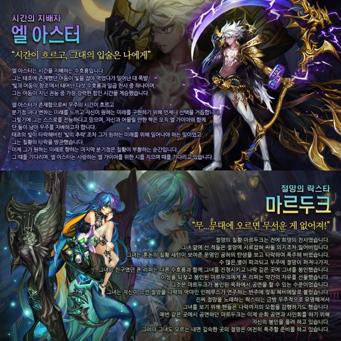 이미지 확대보기이번 업데이트에서 최상위 등급인 세컨드임팩트 영웅 ‘엘 아스터’와 ‘마르두크’가 새롭게 등장한다. ‘시간의 지배자’라는 별명을 지닌 ‘엘 아스터’는 딜러 포지션으로 강력한 공격력을 갖추고 있다. 딜러 포지션에 걸맞게 전투 중 적 1인을 공격하는 것과 동시에 스킬 데미지로 추가 피해를 입힐 수 있다.