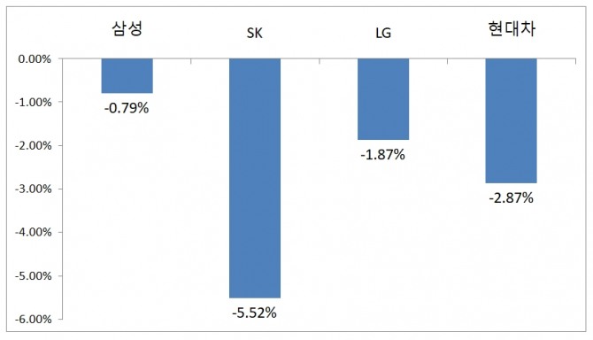 이미지 확대보기15일 한국거래소에 따르면, 지난 8일 이후 이후 15일 오전 11시 30분까지 삼성·SK·LG·현대차 계열사의 상장주식 시가총액은 24조8661억 원 감소한 1301조1726억원을 기록하고 있는 것으로 나타났다.