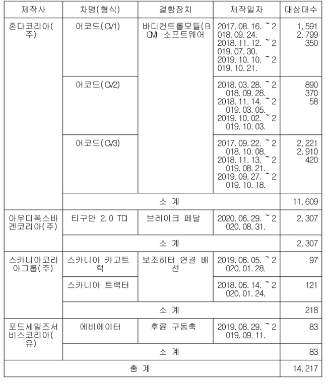 5개 차종 1만4217대 리콜