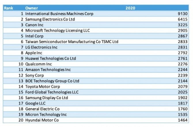 삼성전자는 2019년 6469건과 비교해 1% 감소했지만 순위는 바뀌지 않았다. 삼성전자는 IFI클레임스가 미국 특허취득 정보를 분석해 데이터를 발표하기 시작한 2011년부터 지난해까지 10년 연속 2위 자리를 이어갔다.