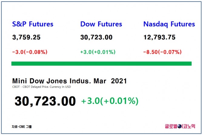 스탠더드 앤드 푸어스(S&P) 500 지수 선물은 0.08%(3포인트) 하락한 3759.25에 거래되고 있고, 나스닥 100 선물도 0.07%(8.5포인트)하락한 1만2793.75에 거래되고 있다.
