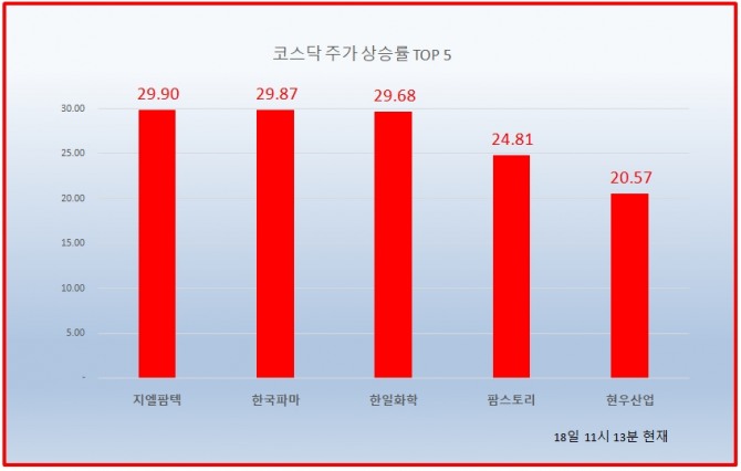 이외에도 한일화학이 29.68% 상승해 1만4200원에 거래되고 있고, 한국파마도 4일 연속 상한가를 기록하며 눈길을 끌고 있다.